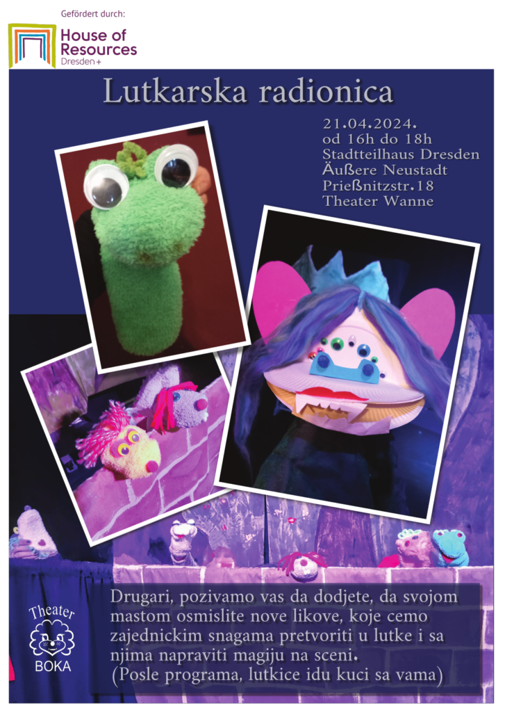 Im Rahmen des Projekts bastelten Kinder aus Ex-Jugoslawischen Ländern an 3 Terminen Puppen und führten mit diesen Theaterstücke auf. Das Projekt wurde von der neu gegründeten Dresdner Elterninitiative Balkan durchgeführt.